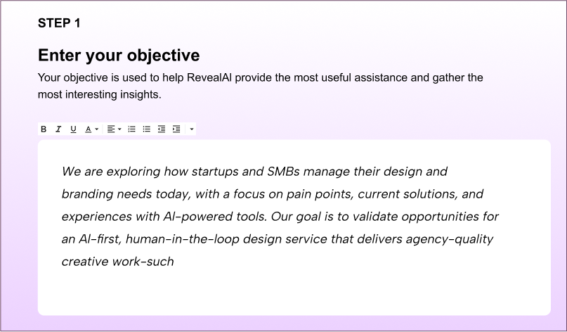 Whether you’re validating a new concept, entering a new market, or listening to employees, Reveal AI makes it faster and easier to understand what people really think and why.